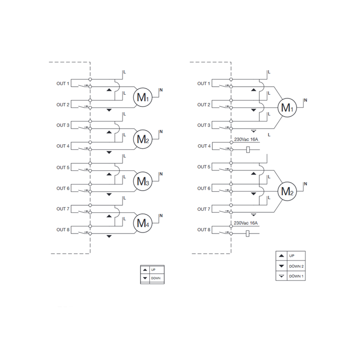 Chaque sortie peut être configurée indépendamment. De plus, 8 blocs logiques sont disponibles pour implémenter des expressions simples avec des opérateurs logiques ou de seuil, ou des expressions complexes avec des opérateurs algébriques et conditionnels.