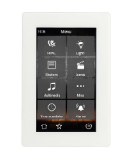 È disponibile con superficie in vetro bianco o nero e può essere installato in verticale o in orizzontale. Funzioni principali: Fino a 48 funzioni di controllo organizzate in 6 pagine configurabili Pagina dei preferiti modificabile dall'utente Immagini di sfondo configurabili Programmi settimanali (fino a 48 canali, 4 programmi/canale) Monitoraggio degli allarmi (fino a 48 allarmi) con registro degli eventi Prestazioni touch: fino a 5 azioni rapide senza uscire dalla modalità di risparmio energetico Modulo scenario integrato Due termostati indipendenti Quattro ingressi multifunzione, configurabili individualmente come ingressi binari o sensori di temperatura Sensore di temperatura integrato Orologio interno (RTC) con batteria di backup Accoppiatore bus KNX integrato Consumo energetico estremamente ridotto