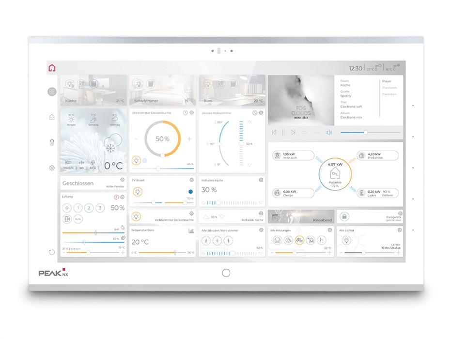Il Control 16 è un potente pannello touch con uno schermo particolarmente ampio rispetto all'alloggiamento. Il pannello di comando Full HD da 15,6 pollici con visualizzazione YOUVI può essere utilizzato per il controllo di stanze o edifici, come display di stato e informazioni, per applicazioni multimediali o come interfono per citofoni. Cinque tasti funzione integrati lateralmente possono essere assegnati individualmente a dispositivi e comandi http. In combinazione con la visualizzazione YOUVI è possibile anche l'assegnazione con logiche. Il pannello touch KNX è progettato per un funzionamento continuo e duraturo e può essere utilizzato come client (ad es. con Gira Homeserver) o come server autonomo. Con le diverse varianti di colore della cornice e i vetri frontali personalizzabili, è possibile soddisfare qualsiasi esigenza di design. Il Control 16 può essere utilizzato in modo flessibile grazie alle diverse opzioni di montaggio.