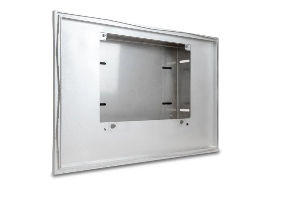 Con questo kit di installazione, il pannello Control 16 può essere montato a filo nella parete. Il kit è composto da un telaio adattatore e da una scatola da incasso. L'installazione a filo della parete mette elegantemente in risalto la centrale di controllo KNX e conferisce un aspetto particolarmente raffinato. L'innovativo telaio adattatore in alluminio previene le crepe da tensione sulla parete circostante. Per un accento estetico, il bordo perimetrale in alluminio può essere lasciato a vista. In alternativa, per un look più discreto, è anche possibile stuccare il bordo.